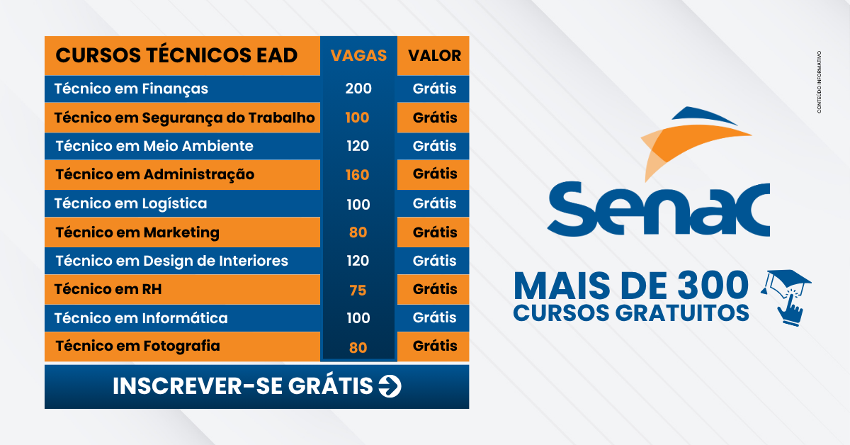 Vagas Limitadas! Cursos 100% Grátis SENAC