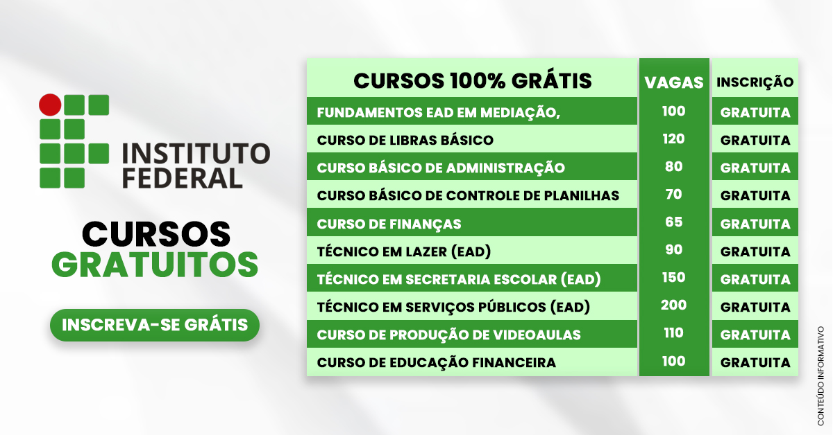 Cursos 100% Gratuitos do Instituto Federal com Certificado? Sim, além de Gratuitos, todos os Cursos são totalmente Online!
